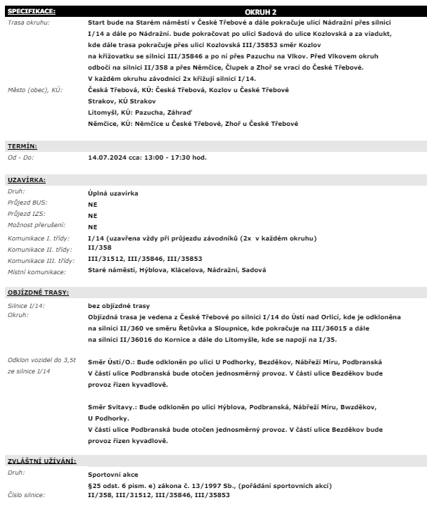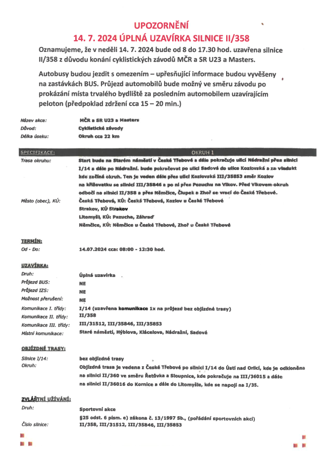 Oznamujeme, že v neděli 14. 7. 2024 bude od 8 do 17.30 hod. uzavřena silnice II/358 z důvodu konání cyklistických závodů MČR a SR U23 a Masters.