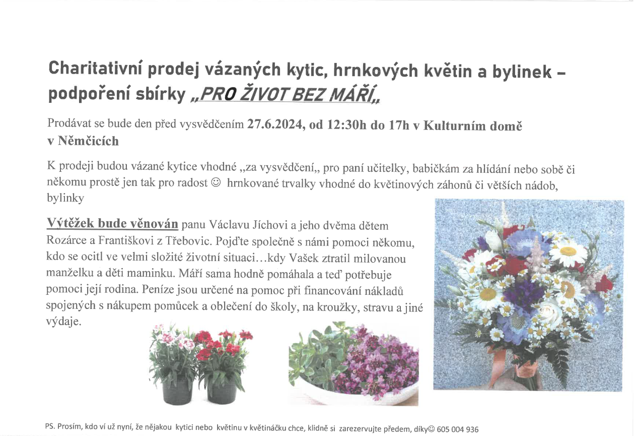 Charitativní prodej vázaných kytic, hrnkových květin a bylinek 27. 6. 2024