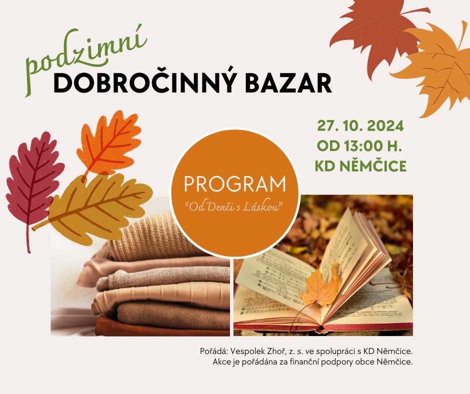 Dobročinný bazar oblečení, obuvi a domácích potřeb pokračuje v Kulturním domě v Němčicích až do neděle 3. 11. 2024. Na výhodné nákupy můžete přijít každý den od 15 hodin v rámci otevírací doby restaurace v KD.