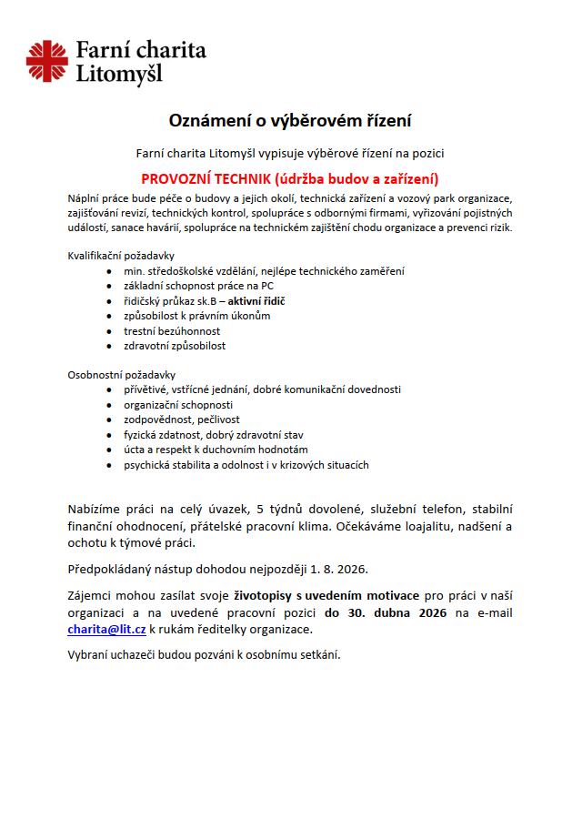 Farní charita Litomyšl - Oznámení o výběrovém řízení