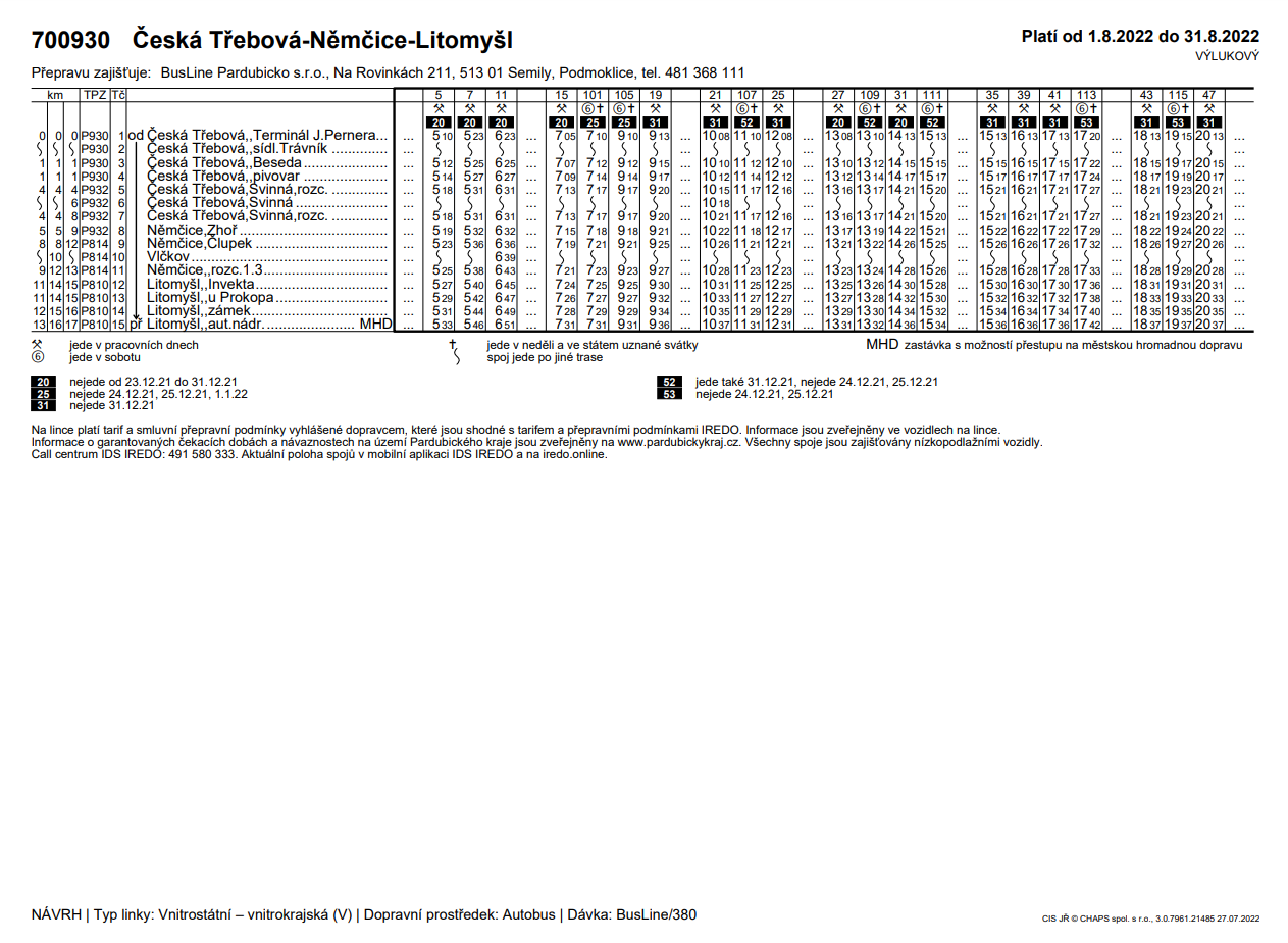 obracím se na Vás s informací k jízdním řádům veřejné linkové osobní dopravy, kterou objednává Pardubický kraj. Jak jistě víte, i nadále přetrvává nedostatek řidičů u dopravce BusLine Pardubicko s.r.o. Tento stav vede k nezajištění některých spojů. Tímto výpadkem spojů jsou především dotčeny okresy Ústí nad Orlicí a Svitavy. Každý den na webových stránkách Pardubického kraje i společnosti OREDO s.r.o., jsou zveřejňovány spoje, které pro následující dny nebudou zajištěny. Protože se tyto spoje pro každý den z části mění, nemají cestující jistotu dopravního spojení. Proto jsme se rozhodli tento nevyhovují stav napravit a to takovým způsobem, který povede ke stabilizaci dopravy od 1.8.2022. Tedy jinak řečeno, od 1.8.2022 každý spoj uvedený v jízdním řádu bude zajištěn. Abychom tuto stabilizaci zajistili, museli jsme přistoupit k omezení některých spojů. Jedná se o zrušení 40 spojů v pracovních dnech a 10 spojů o víkendech. Přílohou Vám zasílám tabulku, která obsahuje přehled zrušených spojů na měsíc srpen a současně přílohou zasílám upravené jízdní řády s platností od 1.8.2022. Jízdní řády budou vylepeny na zastávkách a budou k dispozici na webových aplikacích, které vyhledávají dopravní spojení.