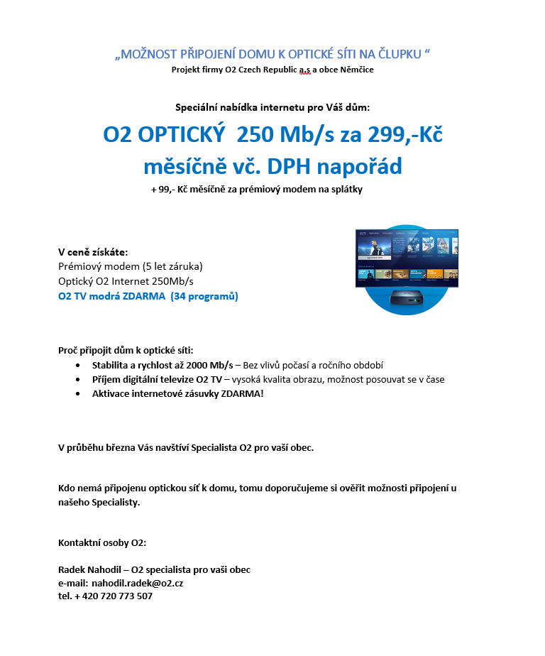 Informuje občany, že v nejbližších dnech budou zástupci O2 nabízet možnost připojení k optické síti na Člupku.