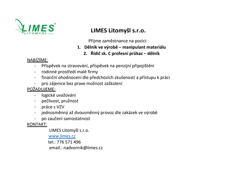 Nabídka práce - LIMES Litomyšl, s. r. o.