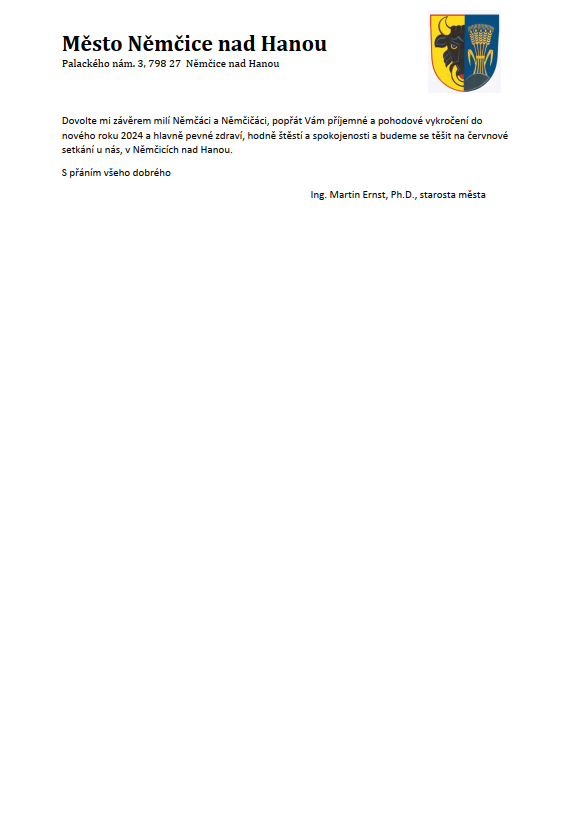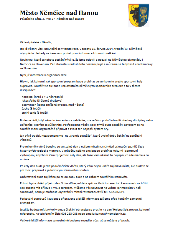 V sobotu 15.června 2024 se koná další ročník Němčické olympiády, tentokrát v Němčicích nad Hanou. Obec bude vypravovat autobus, případní zájemci se hlaste na obecním úřadě nejpozději do 17. května. V případě malého zájmu bude doprava zrušena