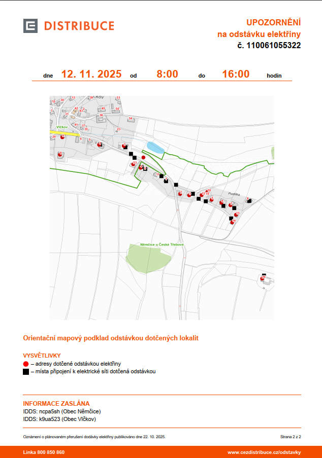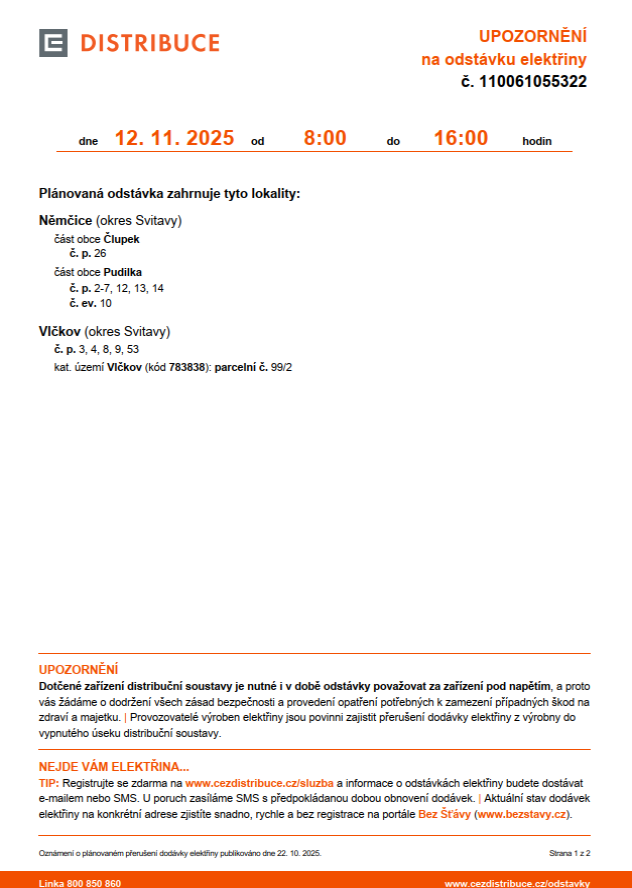 Odstávka elektřiny 12. 11. 2025
