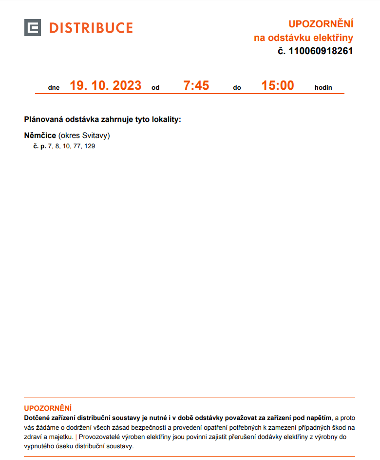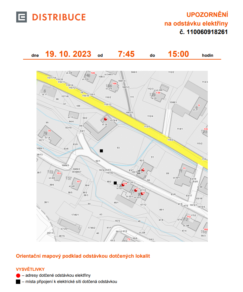 Odstávka elektřiny 19. 10. 2023