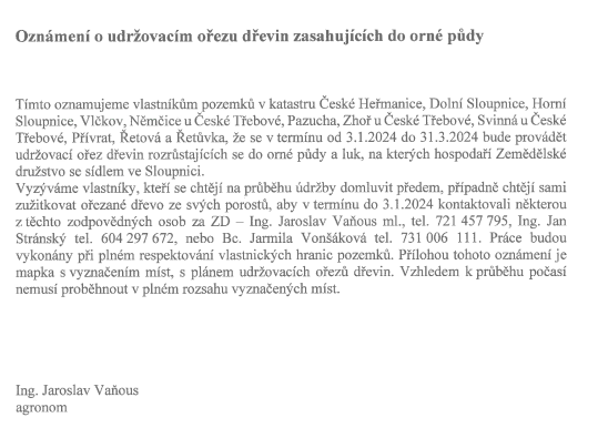 Oznámení o plánovaném ořezu ZD Sloupnice