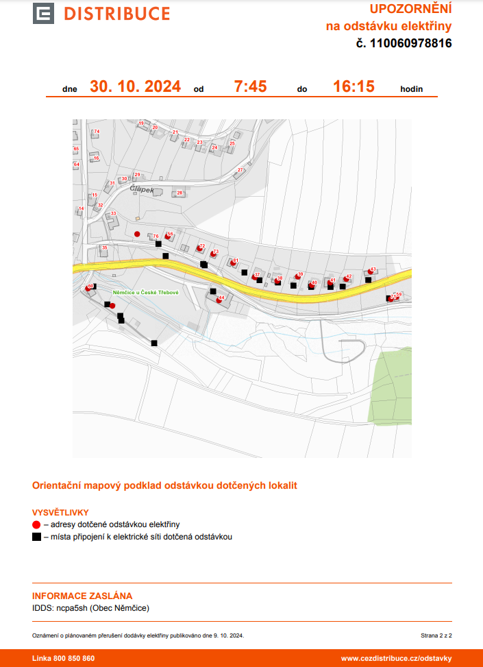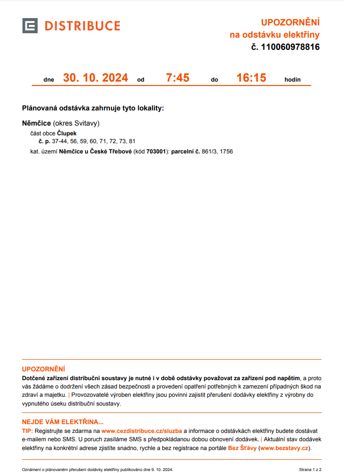 Oznámení o přerušení dodávky elektrické energie 30. 10. 2024