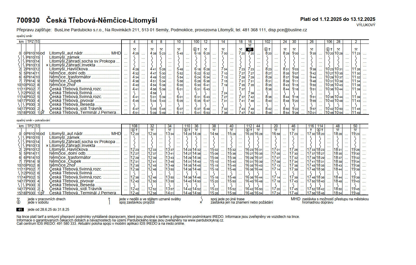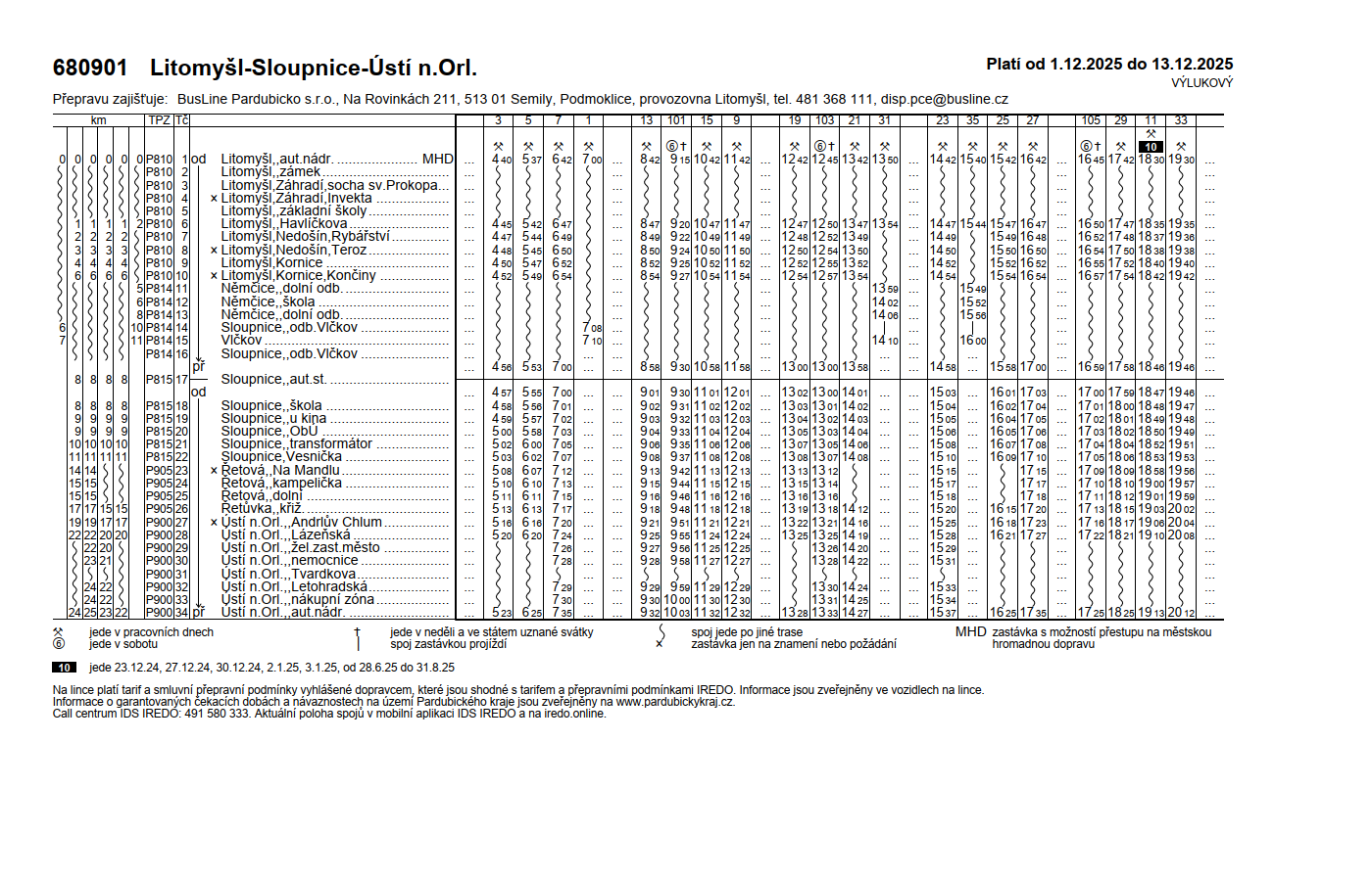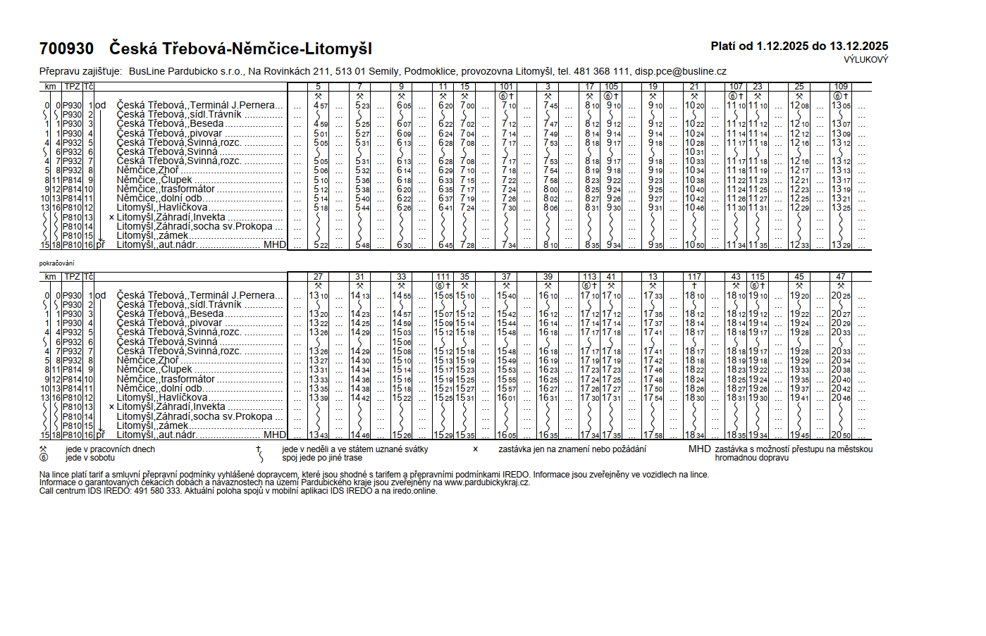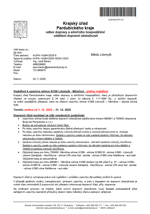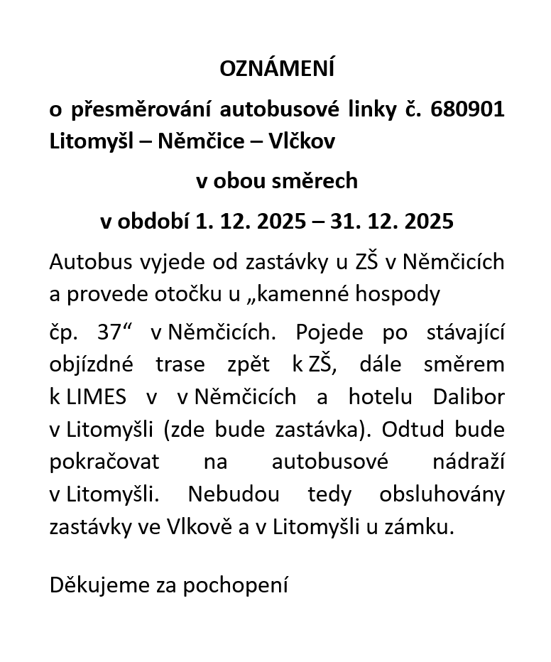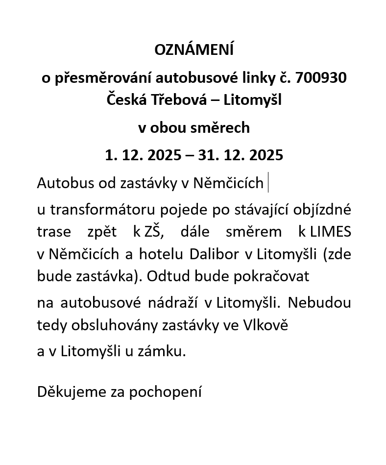 Upozornění o přesměrování autobusové linky č. 700930 a 680901 od 1.12. 2025 do 31. 12. 2025