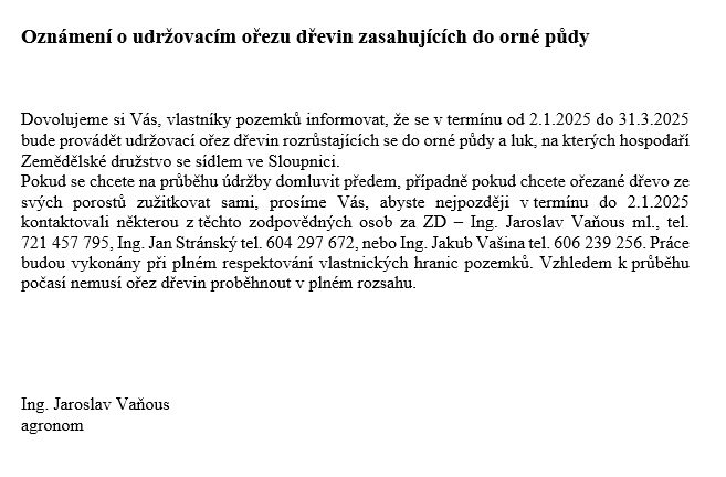 Oznámení o udržovacím ořezu dřevin ZD Sloupnice