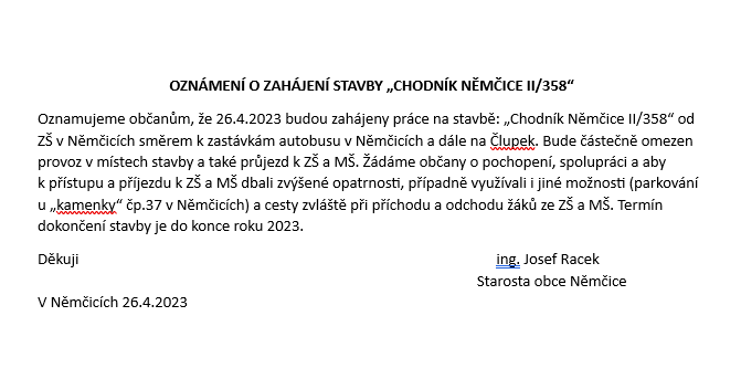 Oznámení o zahájení stavby "Chodník Němčice II/358"