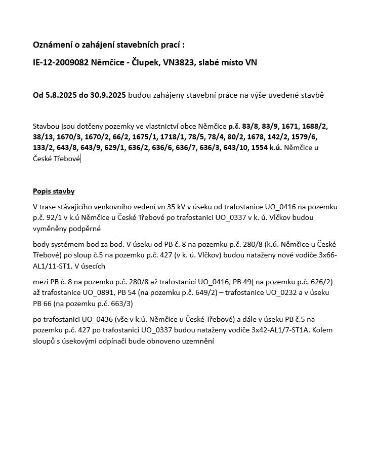 Oznámení o zahájení stavebních prací : IE-12-2009082 Němčice - Člupek, VN3823, slabé místo VN
