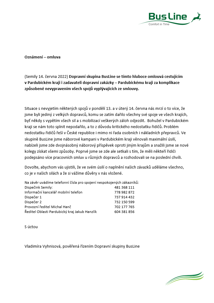 Oznámení - omluva BUS Line