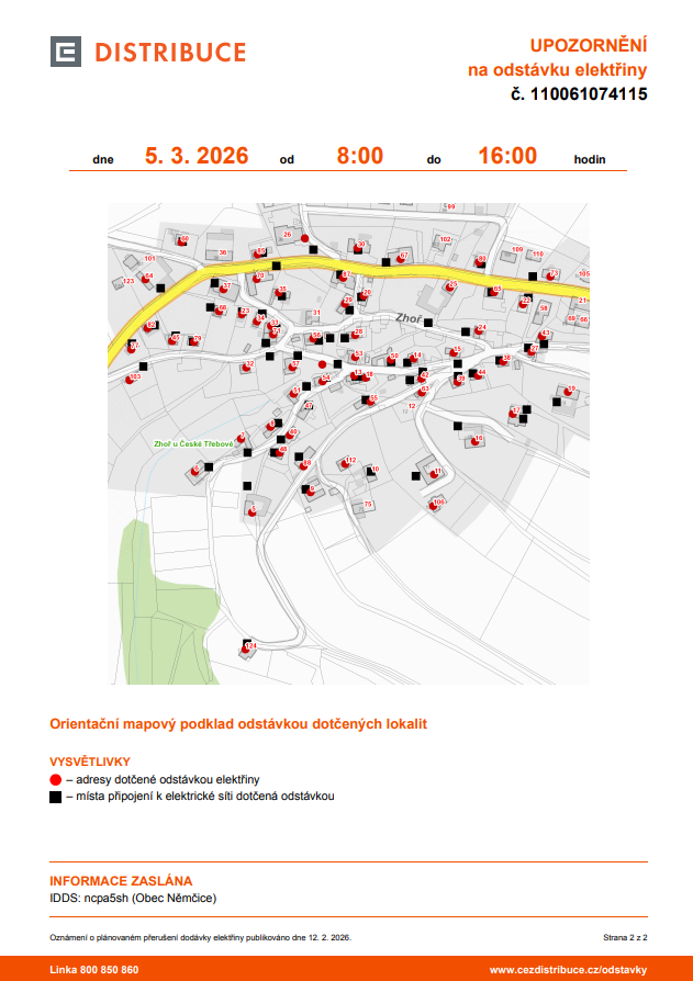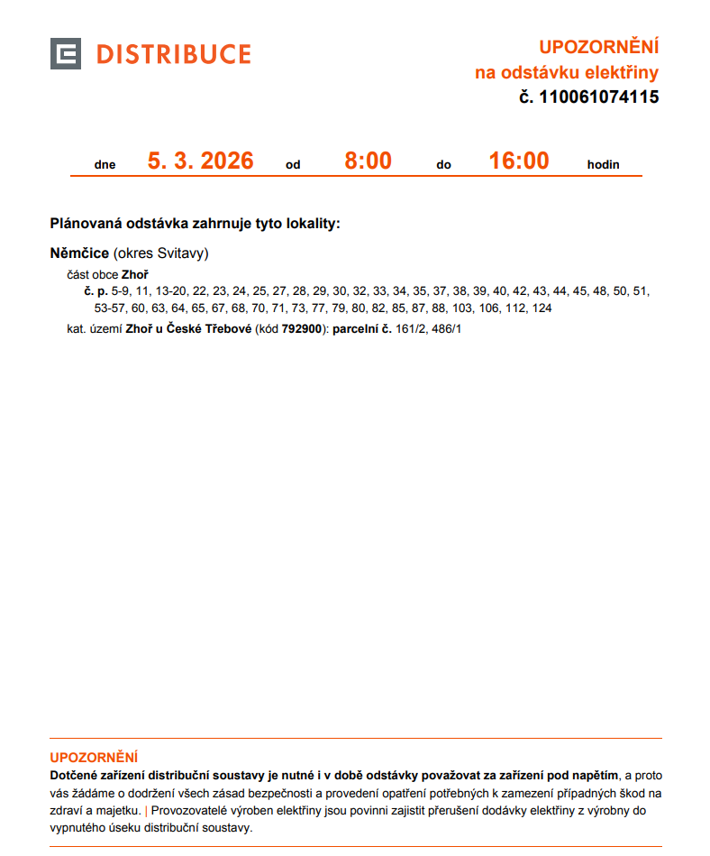 Upozornění na odstávku elektřiny 5. 3. 2026 Zhoř