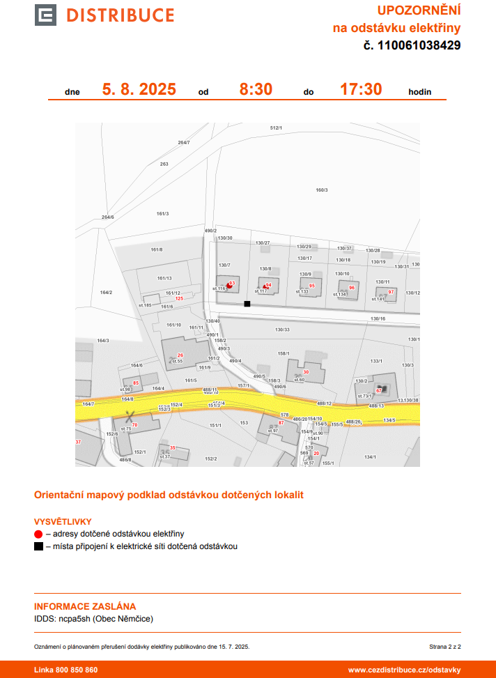 Upozornění na odstávku elektřiny 5. 8. 2025 - čp. 93, 94 ve Zhoři