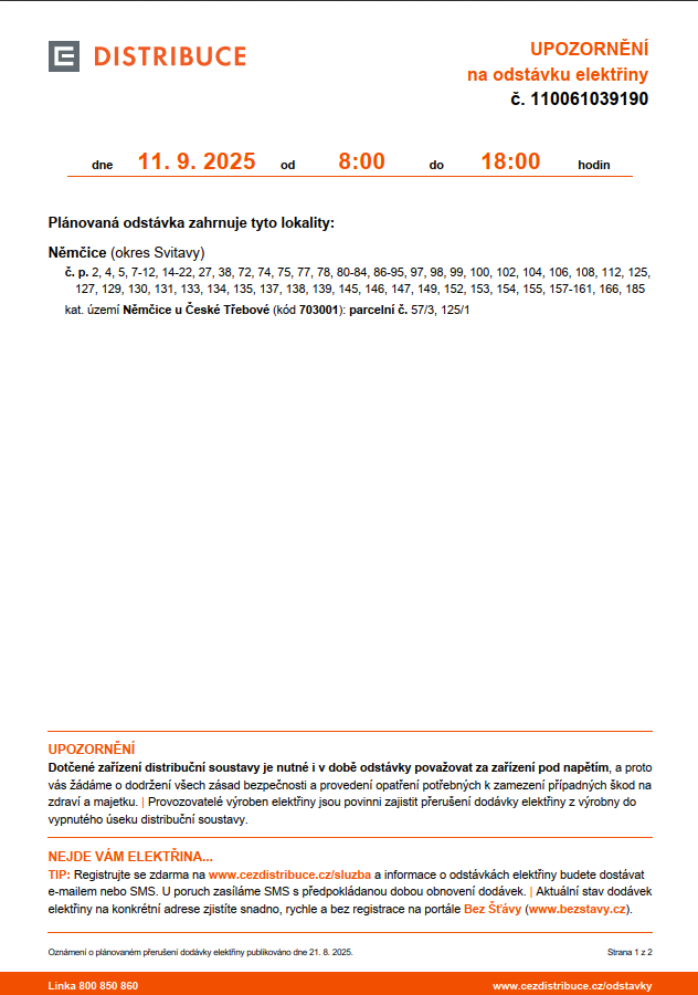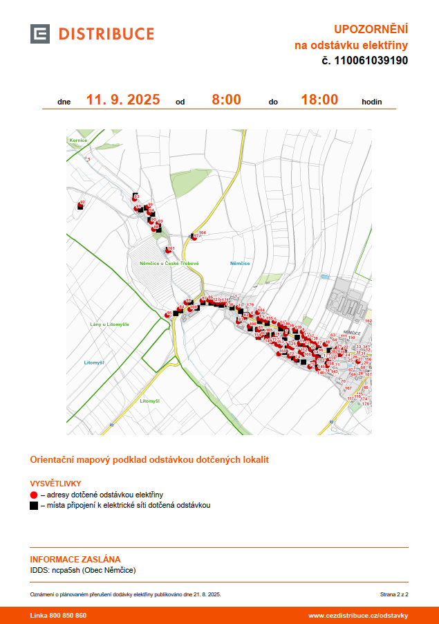 Upozornění na odstávku elektřiny v Němčicích 11. 9. 2025