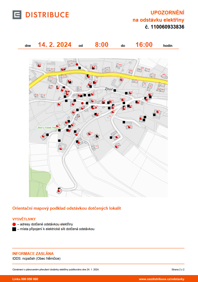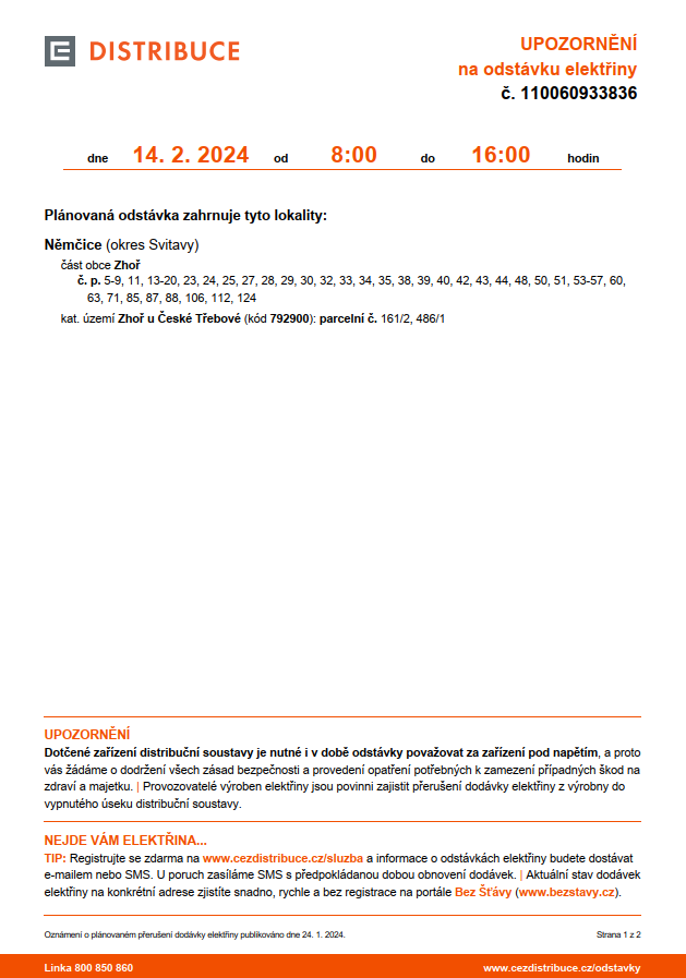 Upozornění na odstávku elektřiny ve Zhoři 14. 2. 2024