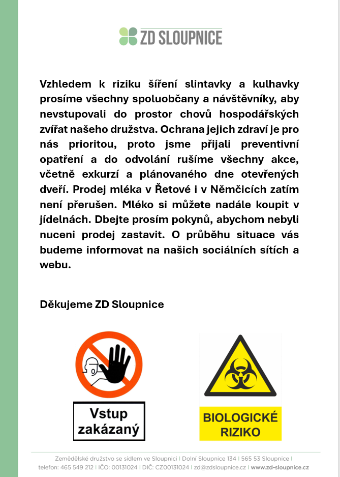 ZD Sloupnice - bezpečnostní opatření proti nákaze slintavky a kulhavky