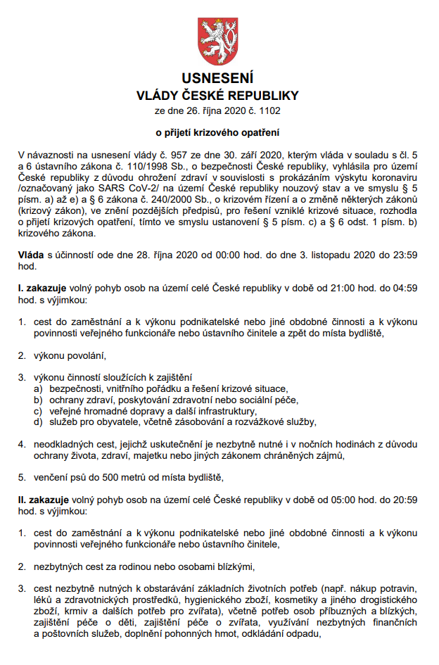 Usnesení vlády ČR ze dne 26. října 2020