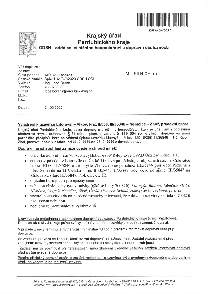 z důvodu správy silnice směr Litomyšl - Vlkov, křižovatky II/358, III/35846 - Němčice - Zhoř bude omezena autobusová linka č. 700820 a cyklobus 680948 v termínu 26.9.2020-27.9.2020.