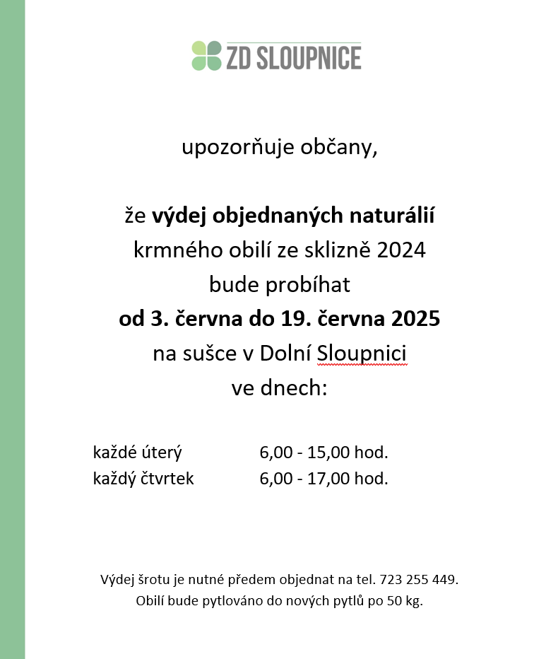 Výdej naturálií ZD Sloupnice 3. - 19. 6. 2025