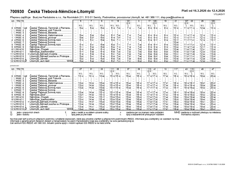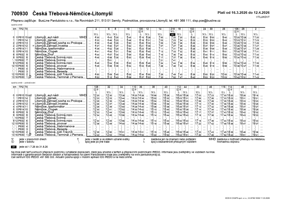 Výlukový jízdní řád 16. 3. - 12. 4. 2026 - uzavřena zastávka Česká Třebová, Beseda