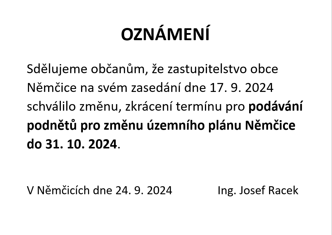 Zkrácení termínu podávání podnětů pro změnu Územního plánu Němčice