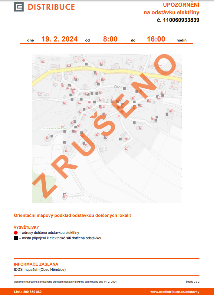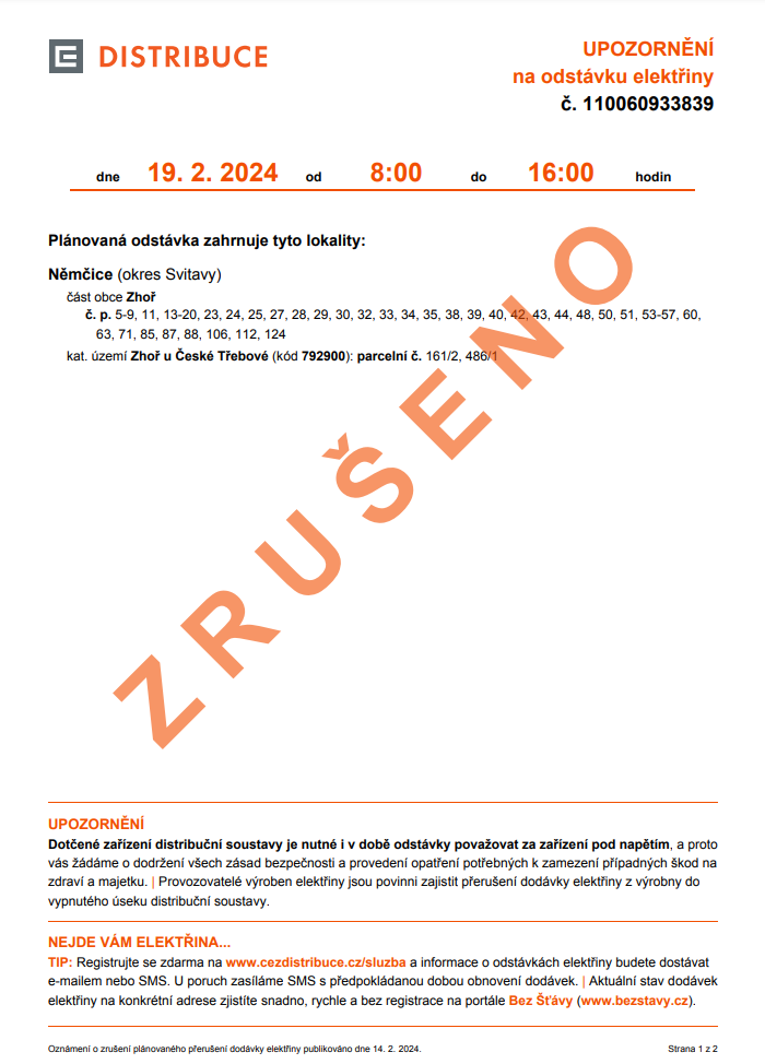 Zrušení plánované odstávky elektřiny ve Zhoři dne 19. 2. 2024